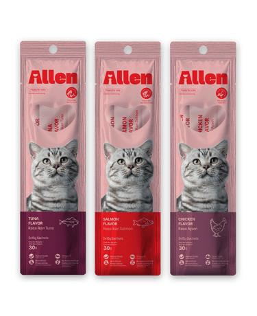 Allen Cat Treats, Human Grade dengan rasa Tuna, Salmon & Chicken. Bebas biji-bijian, jagung, pewarna, pengawet, perasa, dan garam tambahan.