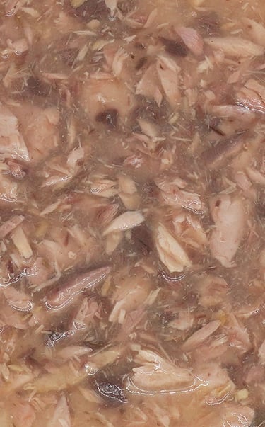 Teksur dari suiran 100% daging tuna asli berkualitas human grade dengan nutrisi yang membantu menutrisi hair & skin, menghidrasi, Omega 3 alami tanpa biji-bijian.